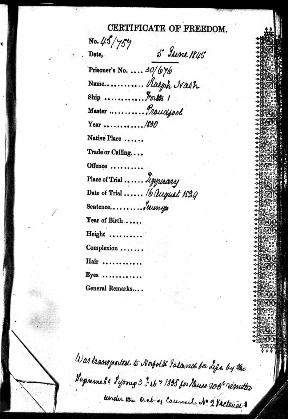 Not long after Ralph had been transported to Norfolk his brother Henry received his certificate of freedom, having served the 7 years transportation sentence the brothers had received in Tipperary. It’s unlikely that Ralph would have been aware of where Henry was at that time, and even if his illiterate brother could have found someone to read letters from him, Ralph would not have been permitted or even had the means to stay connected with his brother. As Henry was enjoying his new freedom Ralph had no prospect of ever being released from prison.